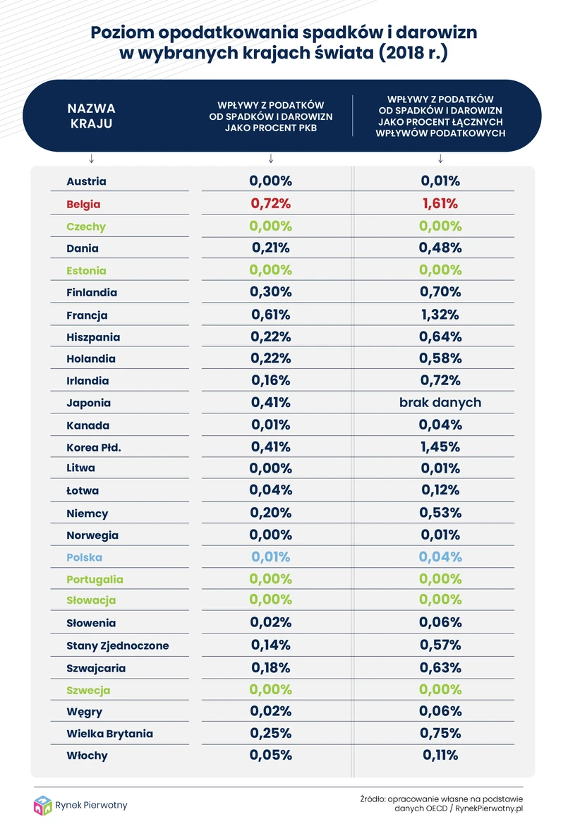 Zestawienie przygotowane przez ekspertów RynekPierwotny.pl potwierdza, że Polska cechuje się relatywnie niskim poziomem opodatkowania spadków i darowizn. Wpływy z tego tytułu w 2018 r. stanowiły odpowiednio 0,01% PKB oraz 0,04% łącznych wpływów podatkowych. W takich krajach jak Belgia oraz Francja, gdzie darowizny i spadki są mocno opodatkowane, analogiczne wyniki wyniosły odpowiednio 0,72%/1,61% oraz 0,61%/1,32%.