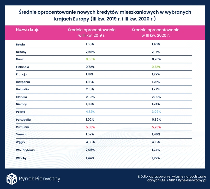Poniższa tabela, którą eksperci RynekPierwotny.pl przygotowali na podstawie danych EMF wskazuje, że w III kw. 2020 r. średnie oprocentowanie nowych kredytów mieszkaniowych z Polski (3,09%) było znacznie mniejsze niż 12 miesięcy wcześniej (4,32%). Nasz kraj nadal wyróżniał się jednak niekorzystnie na tle pozostałych analizowanych państw. Podobnie jak w III kw. 2019 roku, wyższe wyniki odnotowano tylko dla Rumunii oraz Węgier. Nowe „hipoteki” były relatywnie drogie także w przypadku Czech oraz Irlandii. Warto odnotować, że cztery wspomniane kraje z wysokim oprocentowaniem nowych kredytów mieszkaniowych (Polska, Czechy, Węgry oraz Rumunia) cechowały się w 2020 r. wysoką inflacją na tle całej Unii Europejskiej. Opisywana sytuacja z pewnością wpływała na politykę kredytodawców, którzy w ramach swobodnie ustalanych marż brali pod uwagę także większe ryzyko gospodarcze.