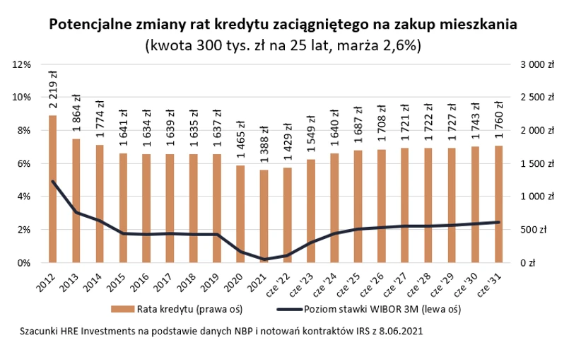 Obecna sytuacja kusi wręcz do składania wniosków kredytowych – niski wkład własny, niskie stopy procentowe. Należy jednak pamiętać, że w perspektywie kilku kwartałów raty kredytów mogą zacząć wzrastać. Zwłaszcza jeżeli utrzymany zostanie wzrost PKB, wynagrodzeń i spadek bezrobocia. Jeżeli takie tendencje się utrzymają, możemy być pewni podwyżek stóp procentowych. I choć nie powinny być one zbyt gwałtowne, to trzeba być na nie przygotowanym. Prognozy sugerują, że w 2031 roku raty będą wyższe o 20-30% niż obecnie. Dla pokrzepienia serc możemy jedynie dodać, że z aktualnych prognoz wynika, że najpewniej wynagrodzenia w Polsce będą rosnąć szybciej niż raty.