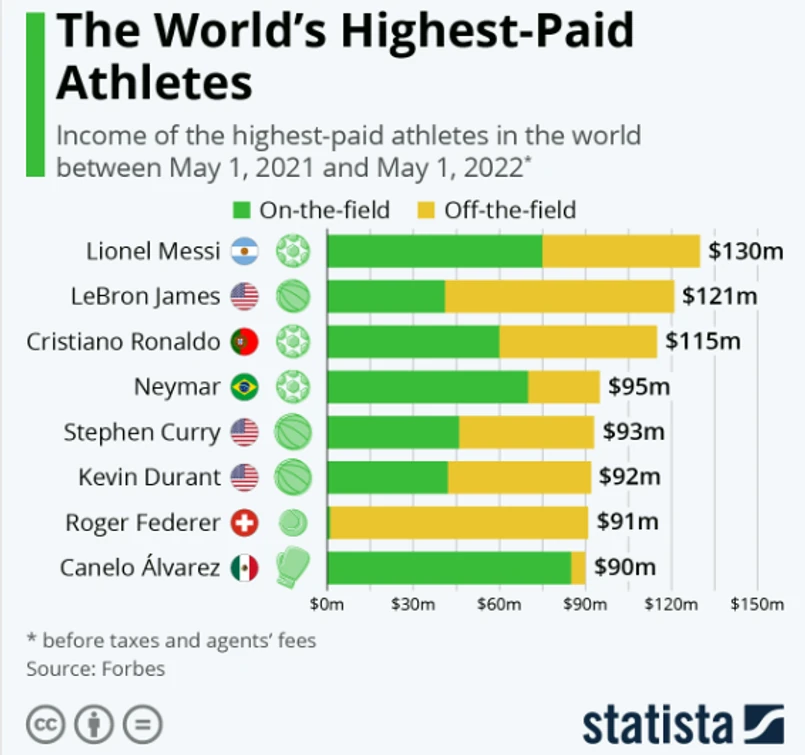 O ile w przypadku Messiego, Cristiano R., Stephena Curry’ego czy Kevina Duranta pieniądze zarobione „na boisku” i „poza boiskiem” są podobne, o tyle w przypadku Rogera Federera niemalże cały dochód został wypracowany na działalności pozasportowej, a w przypadku Canelo na ringu.