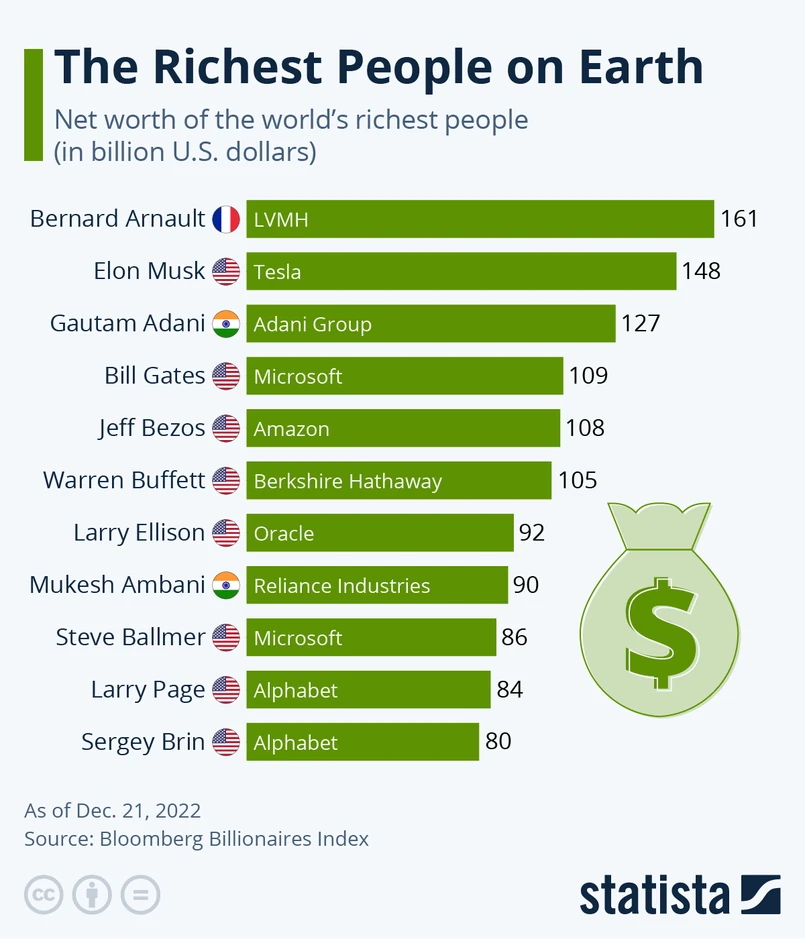 Wartość netto liderów rankingu przekracza 100 mld dol. Ten rok był bardzo trudny dla niektórych krezusów. Majątek Muska skurczył się aż o 122 mld dol., a Jeffa Bezosa o 82,5 mld dol. (wynosi obecnie 110 mld dol., co plasuje go na 5. miejscu zestawienia). Największym wygranym w 2022 jest Adani, którego fortuna urosła o 44,6 mld dol.