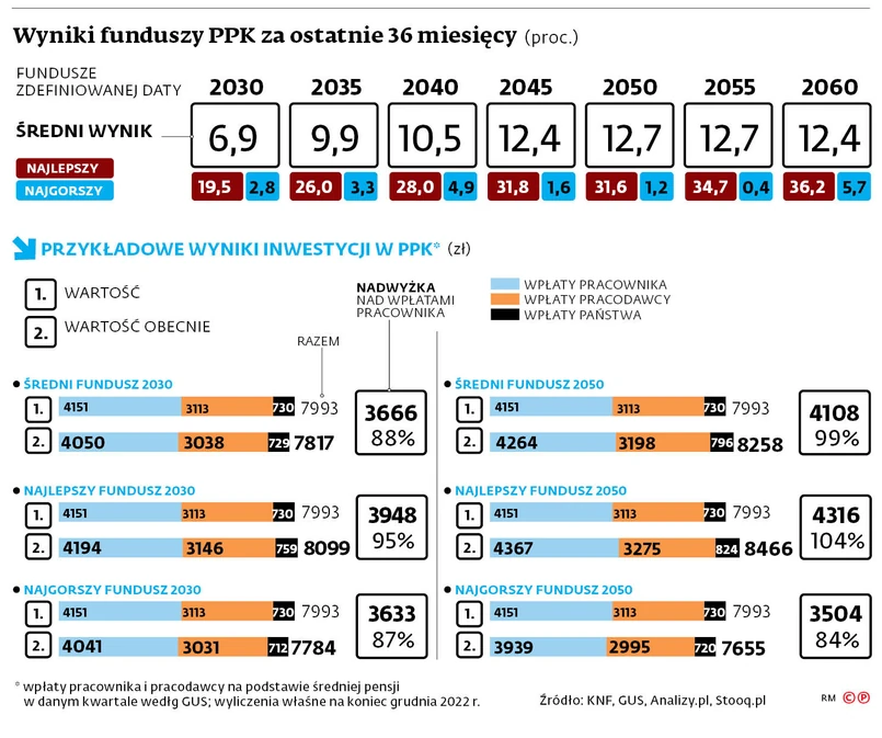 Jeszcze miesiąc wcześniej, pod koniec grudnia, trzyletnie stopy zwrotu niektórych funduszy funkcjonujących w ramach pracowniczych programów kapitałowych (PPK), obejmujące niemal cały okres ich działania, były ujemne. Jednak kontynuacja trendu wzrostowego na warszawskiej giełdzie na przełomie lat 2022 i 2023. sprawiła, że według wycen z 24 stycznia wszystkie 135 funduszy, których horyzont inwestycyjny dotyczy roku 2030 lub późniejszego, znalazło się na plusie. Bieżące wyniki nie będą miały dużego wpływu na końcowy efekt oszczędzania na emeryturę, ale ich analiza może mieć znaczenie z punktu widzenia decyzji o pozostaniu lub wypisaniu się z programu PPK. W marcu ok. 8 mln pracowników zatrudnionych w firmach prywatnych i sektorze publicznym zostanie automatycznie zapisanych do programu. Te osoby będą mogły zaakceptować decyzję systemu lub złożyć deklarację o wystąpieniu z PPK.
