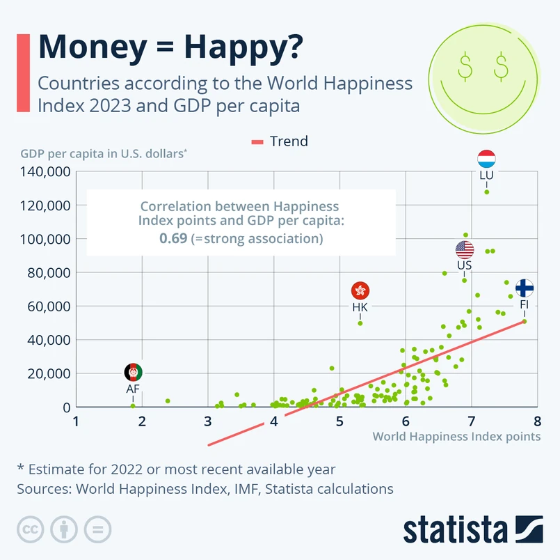 Korelacja dochodzi do wartości 0,69, co oznacza silny związek między dochodami na mieszkańca a poziomem szczęścia wyrażonym w Światowym Indeksie Szczęścia. Istnieją jednak odstępstwa i wartości odstające. Na przykład PKB na mieszkańca Hongkongu wynoszący pond 49 tys. USD jest stosunkowo wysoki, ale jego wskaźnik szczęśliwości wynoszący 5,31 jest stosunkowo niski. Wiele krajów o podobnych wynikach indeksu szczęścia ma PKB na mieszkańca poniżej 10 tys. USD.