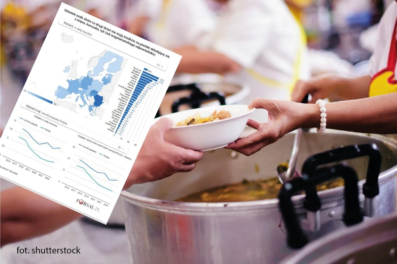 W Polsce w całej populacji odsetek osób, których co drugi dzień nie stać na porządny posiłek, wzrósł w 2022 r. do 4,1 proc. z 3,6 proc. w 2021 r. W grupie osób zagrożonych ubóstwem odsetek ten zmienił się nieznacznie. W 2022 r. wynosił 10,2 proc., a w 2021 r. - 10,3 proc.