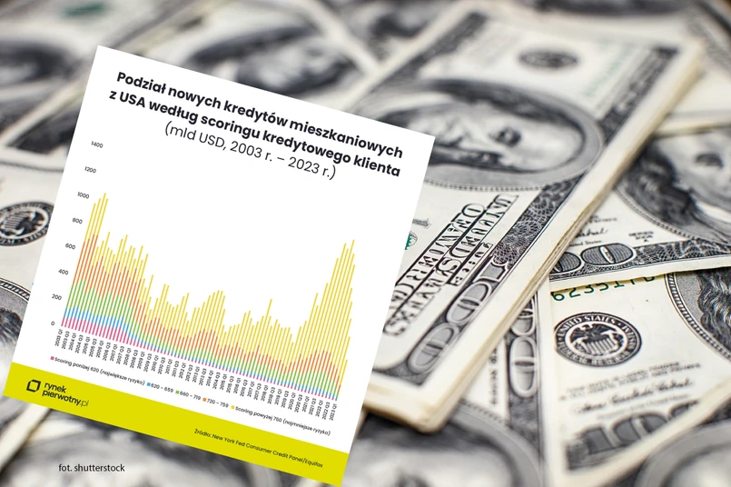 Popularność stałego oprocentowania to nie jedyny czynnik, który tłumaczy zaskakująco dobrą dla części obserwatorów spłacalność amerykańskich „hipotek”. Poniższy wykres na pewno może sporo wyjaśnić w tym temacie. Pokazuje on bowiem, że w minionej dekadzie z rynku nowych kredytów mieszkaniowych w USA praktycznie zniknęli klienci posiadający najniższą ocenę wiarygodności kredytowej (scoring poniżej 620 punktów). Zmniejszyło się też znaczenie klientów ze scoringiem wynoszącym 620 - 659 punktów. Natomiast w czasie hipotecznych żniw z lat 2020 - 2021, banki udzieliły kredytów mieszkaniowych rekordowej liczbie osób z wysokim scoringiem. Pamiętajmy również, że Amerykanie zaciągający nowy kredyt mieszkaniowy ze stałym oprocentowaniem na 30 lat, mogli w 2021 r. wybierać stawki wynoszące np. 2,70% - 3,00%. To spora różnica względem obecnych wyników przekraczających 7,00%.