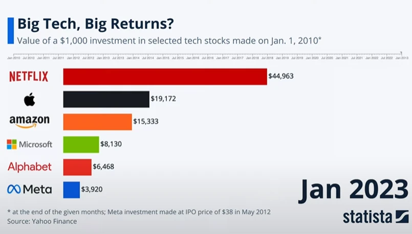Gdybyś 1 stycznia 2010 roku zdecydował się na zainwestowanie 1 tys. dol. w akcje Apple’a, to w styczniu 2023 roku miałbyś ponad 19 tys. dol. W przypadku Amazona inwestycja zwróciłaby się w analogicznym okresie 15-krotnie, Microsoftu 8-krotnie, Alphabetu (spółki-matki Google’a) 6-krotnie, a dla Mety blisko 4-krotnie.