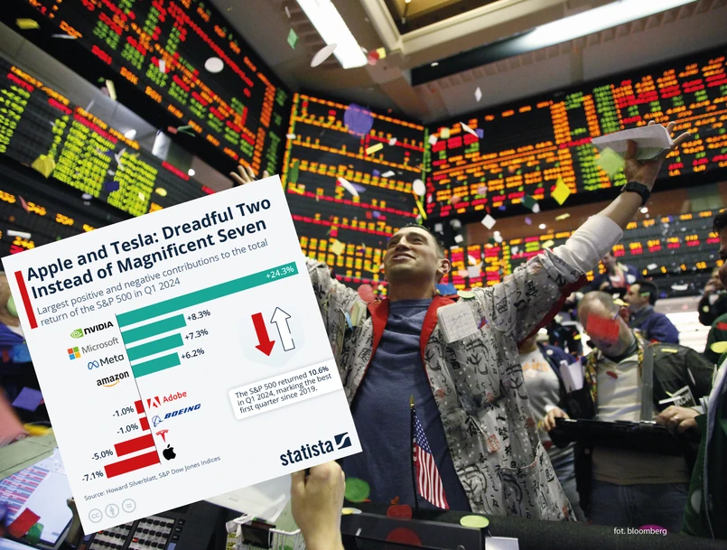 Największy wpływ na wzrost indeksu S&P 500 miał producent chipów Nvidia. W pierwszym kwartale 2024 r. akcje producenta mikroprocesorów podrożały o ponad 82 proc., co stanowiło prawie jedną czwartą wzrostu indeksu. Ponad 8-proc. wpływ na wzrost indeksu miał Microsoft, kluczowy inwestor w OpenAI. W pierwszym kwartale akcje Microsoftu podrożały o 11,9 proc. Także Meta i Amazon miały pozytywny wpływ na indeks S&P 500. W pierwszych kwartale 2024 r. akcje Meta podrożały o ponad 37 proc., a Amazon o blisko 18 proc., co przełożyło się na udział w indeksie na poziomie odpowiednio +7,3 i +6,2 proc.
