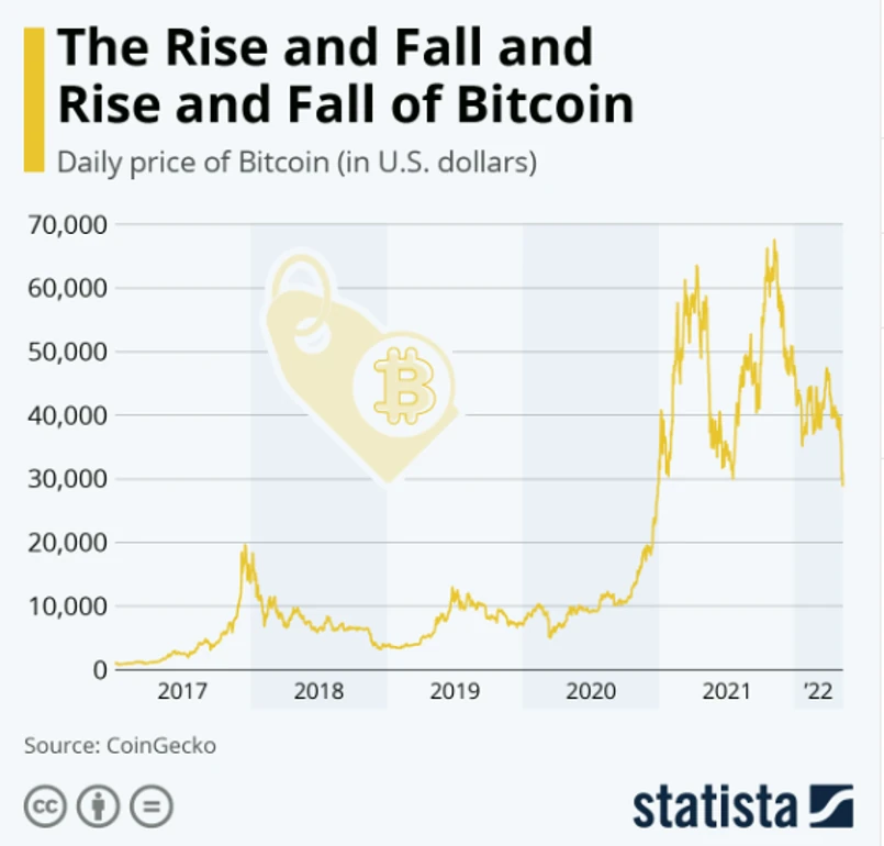 Inwestorzy, którzy ulokowali swoje środki w tym cyfrowym pieniądzu doświadczają prawdziwej emocjonalnej huśtawki. W kwietniu 2021 roku osiągnęła historyczny szczyt na poziomie ponad 60 tys. dol., by pod koniec lipca kosztować mniej niż 30 tys. dol. Nie musieliśmy długo czekać na kolejny zwrot akcji. Na początku listopada zeszłego roku bitcoin testował już nowe szczyty, w rekordowym momencie osiągając ponad 67 tys. dol.