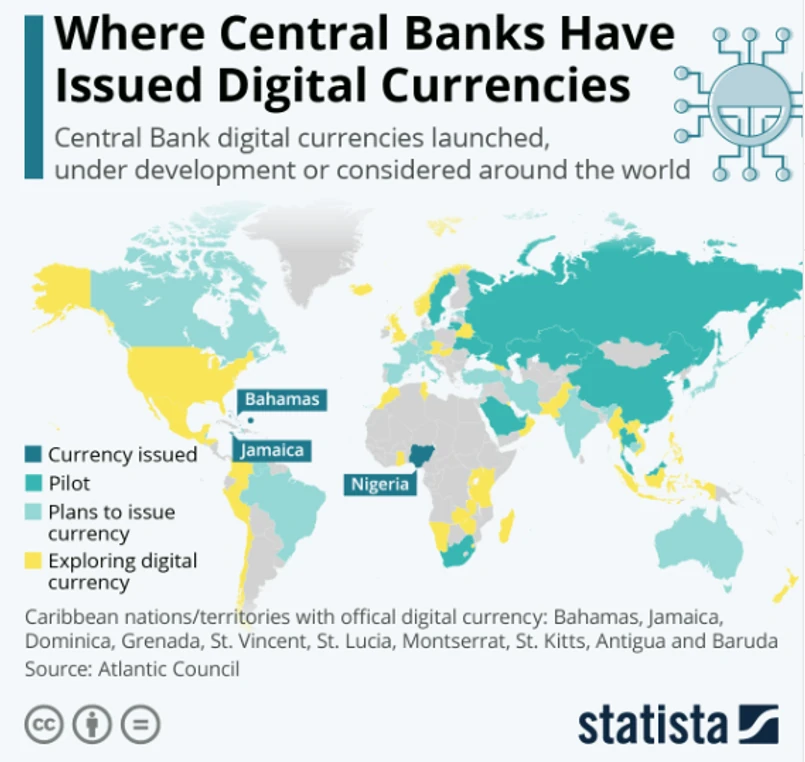 Pierwszym krajem, który zdecydował się na ten krok były Bahamy. Niedługo po tym cyfrowy pieniądz szybko zaczął rozprzestrzeniać się w regionie: został wprowadzony w Grenadzie, Dominice oraz Saint Lucii. Nie tylko małe karaibskie kraje mogą pochwalić się oficjalnym państwowym cyfrowym pieniądzem – do tego grona dołączyła także Nigeria.