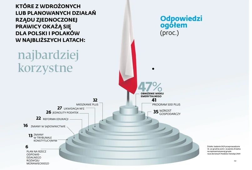 Krócej pracować i mieć więcej pieniędzy. Tego od rządu chcą Polacy - wynika z sondażu DGP w panelu badawczym Ariadna.Żelazne punkty program PiS: obniżka wieku emerytalnego, 500 plus, wzrost gospodarczy oraz program Mieszkanie Plus to działania rządu, które mogą się okazać najbardziej korzystne dla Polski i Polaków w 2017 r. – wynika z sondażu DGP w panelu badawczym Ariadna. / Dziennik Gazeta Prawna