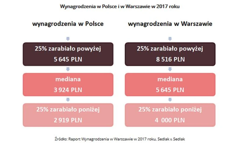 Z przedstawionych powyżej analiz wynika, że zarobki osób zatrudnionych w Warszawie nadal znacznie przewyższają wynagrodzenia osób pracujących w innych miejscowościach. Wpływ na wysokie płace w stolicy kraju ma przede wszystkim lokowanie tam centrali największych polskich oraz zagranicznych przedsiębiorstw. W Warszawie pracuje zdecydowanie więcej specjalistów, kierowników oraz dyrektorów niż w innych częściach naszego kraju. Inna struktura zatrudnienia przekłada się na wyższe zarobki.
