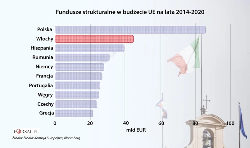 4 Włochy to jedyny kraj w południowej i wschodniej Europie, który w 2016 roku był płatnikiem netto do unijnego budżetu. Hiszpania i Portugalia więcej dostają ze wspólnej kasy niż do niej wpłacają. Jednak największym beneficjentem unijnych funduszy jest Polska.