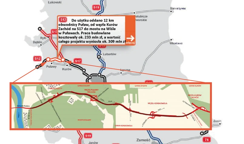 1 W trakcie realizacji projektu powstały m.in.: węzły Puławy Azoty, Puławy Wschód i Końskowola, cztery wiadukty drogowe, trzy mosty w ciągu drogi ekspresowej, przejścia dla zwierząt oraz drogi dojazdowe dla obsługi ruchu lokalnego.