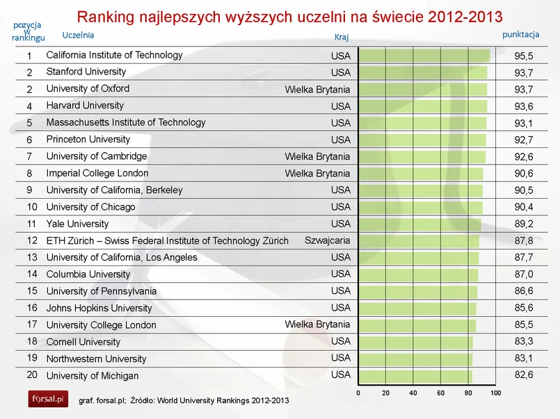 Oto ranking 400 najlepszych uczelni na świecie "Times Higher Education World University 2012-2013", opracowany przez agencję Reuters. W pierwszej dziesiątce znalazły się same uczelnie anglosaskie.