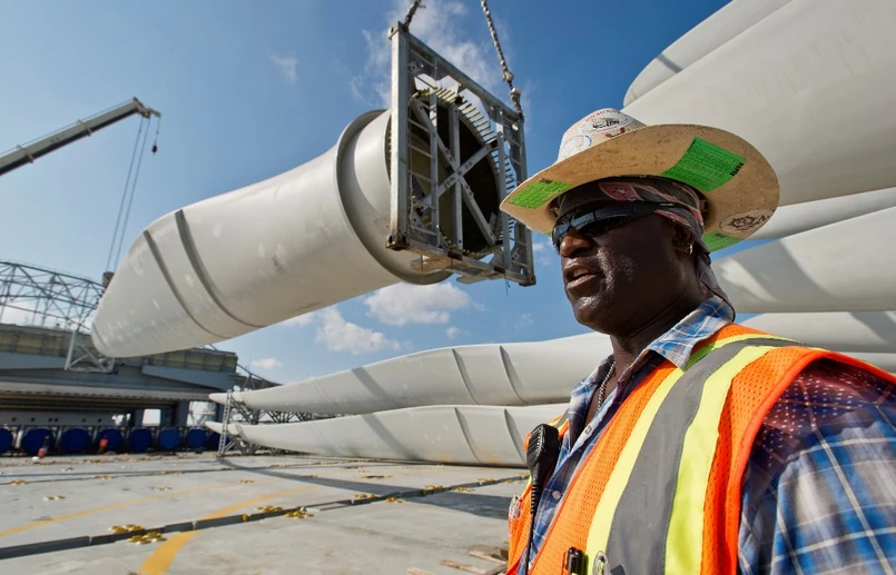 1 Pracownicy ładują łopaty turbiny wiatrowej na platformę kolejową w Porcie Corpus Christi w Teksasie. Środa, 5 września 2012. Port Corpus Christi transportuje więcej części producentów turbin wiatrowych niż jakikolwiek inny port w Teksasie.