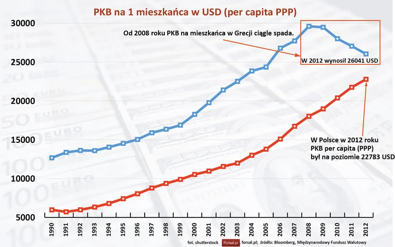 1 Zeszłoroczny dochód narodowy na 1 mieszkańca Grecji był o ponad jedną piątą niższy niż w roku 2008. W tym roku zaczął on już minimalnie rosnąć, ale przed końcem dekady standard życia nie wróci do poziomu sprzed kryzysu. Dla porównania, realny dochód narodowy na 1 mieszkańca Polski liczony w złotówkach zwiększył się przez ostatnie sześć lat o 16,5 proc. A uwzględniając parytet siły nabywczej, PKB na 1 mieszkańca Polski zbliża się do poziomu Grecji. Czy Grecja rzeczywiście wraca do formy po kryzysie? Czytaj tutaj.