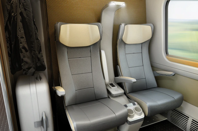 15 Jest elementem licznych teorii spiskowych. Najpierw z postępowania wylecieli z hukiem Hiszpanie z firm CAF i Talgo. W grudniu 2008 r. zakończono rozmowy z czterema firmami: Alstomem, Siemensem oraz dwoma konsorcjami: AnsaldoBreda i Newagu oraz Bombardiera i Pesy. Polscy producenci nie mogli sami złożyć oferty, bo nie mieli wówczas doświadczenia (wciąż nie mają, chociaż Pesa opracowuje o 80 proc. tańszy pociąg Dart, który docelowo ma być polską odpowiedzią na Pendolino). Dlatego kiedy zagraniczni partnerzy wycofali się z walki o polski rynek, Pesa i Newag zostały na lodzie. We wrześniu 2010 r. na placu boju została tylko jedna firma: Alstom. Dopiero po kilku miesiącach wyszło na jaw, że zaoferowali konstrukcję bez wychylnego pudła i dzięki temu ograniczyli swoje koszty o 10–15 proc. (patrz: Wychylne pudło). Na slajdzie siedzenia w klasie business. Źródło: materiały prasowe.
