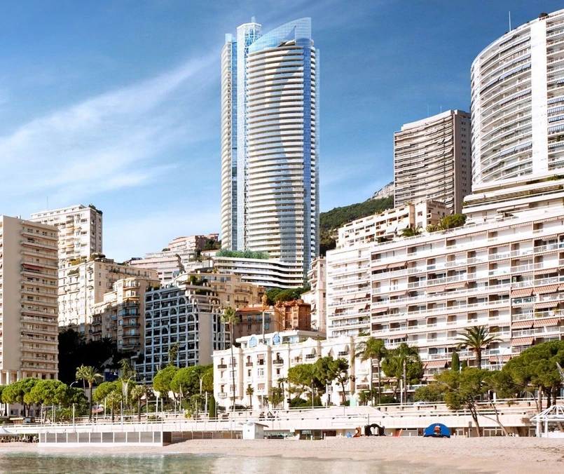 1 Na samym szczycie nowego budynku znajduje się 5 – kondygnacyjny penthouse o powierzchni 3,3 tys. m kw. Składa się on z 5 sypialni, 3 łazienek, sali kinowej i basenu ze zjeżdżalnią usytuowaną na zewnątrz elewacji, co czyni z tego apartamentu zupełny unikat. Atutami inwestycji są też panoramiczne okna, wysoki standard wykończenia, system „inteligentnego domu”, a także możliwość skorzystania z całodobowej usługi concierge, limuzyny, centrum SPA, sali gimnastycznej, siłowni, basenu i serwisu sprzątającego. Cena? Penthouse na szczycie wieży wyceniony został na co najmniej 300 mln EUR (ponad 1,2 mld zł). Jeśli faktycznie zostanie za taką kwotę kupiony, to na liście najdroższych apartamentów wyprzedzi dotychczasowego rekordzistę - apartament w budynku Hyde Park One w Londynie, który został w 2014 roku sprzedany za około 700 mln zł, a więc prawie o połowę mniej niż wycena najdroższego apartamentu w Tour Odeon. Zdjęcie: Penthouse w Tour Odeon, źródło: Tour Odéon Monaco
