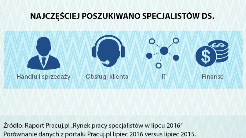 W lipcu na portalu Pracuj.pl opublikowano 39 007 ogłoszeń o pracę, co oznacza wzrost liczby ofert pracy o 3 proc. w porównaniu z analogicznym okresem w 2015 roku. Najwięcej ofert pochodziło z branż: handel i sprzedaż, bankowość/finanse/ubezpieczenia oraz przemysł ciężki. Pracodawcy poszukiwali głównie specjalistów ds. handlu i sprzedaży, obsługi klienta oraz IT. O pracę najłatwiej było w województwach: mazowieckim, dolnośląskim i małopolskim.