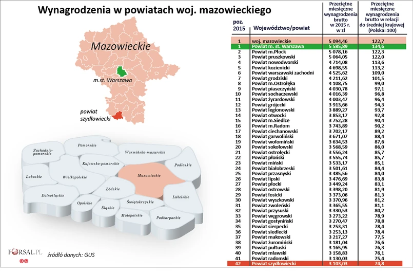 Wśród wszystkich powiatów (bez podziału na województwa) Warszawa wcale nie jest liderem wysokości zarobków. Najwięcej zarabiają pracownicy zatrudnieni w regionach, gdzie króluje przemysł wydobywczy. Na czele rankingu znajduje się powiat lubiński z woj. dolnośląskiego. Kolejne są Jastrzębie-Zdrój (woj. śląskie) i powiat bełchatowski (woj. łódzkie). Warszawa znalazła się dopiero na czwartym miejscu.