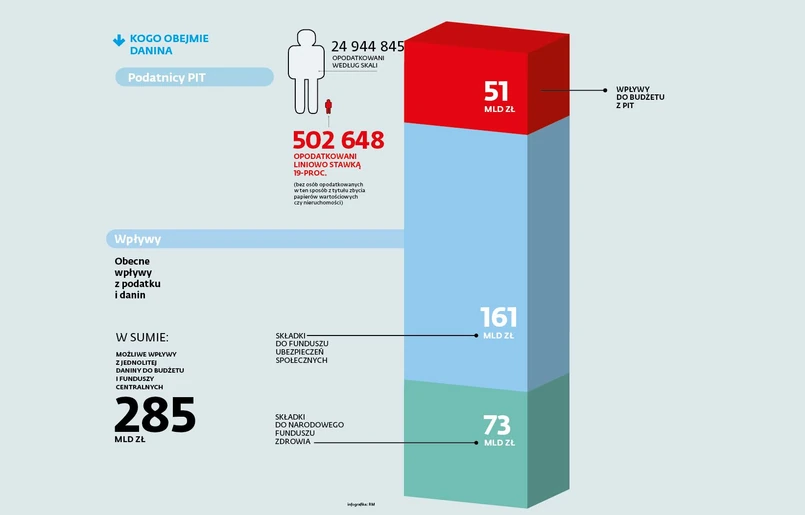 Najwcześniej po pierwszym listopada poznamy założenia podatku jednolitego. Na zapleczu rządu trwają prace nad szczegółowymi rozwiązaniami. Ostatnio uchwalone ustawy o połączeniu baz danych ZUS i urzędów skarbowych mają ułatwić przygotowanie prognoz na temat skutków wprowadzenia planu Beaty Szydło. Jeśli do tego dojdzie, będziemy świadkami prawdziwej rewolucji. W jeden strumień zostaną scalone płacone do tej pory osobno składki na ubezpieczenia społeczne. Zebraliśmy dostępne na dziś informacje na temat tego, jak będzie wyglądał nowy system. W naszej analizie wskazujemy również na potencjalne pułapki, które mogą położyć reformę.