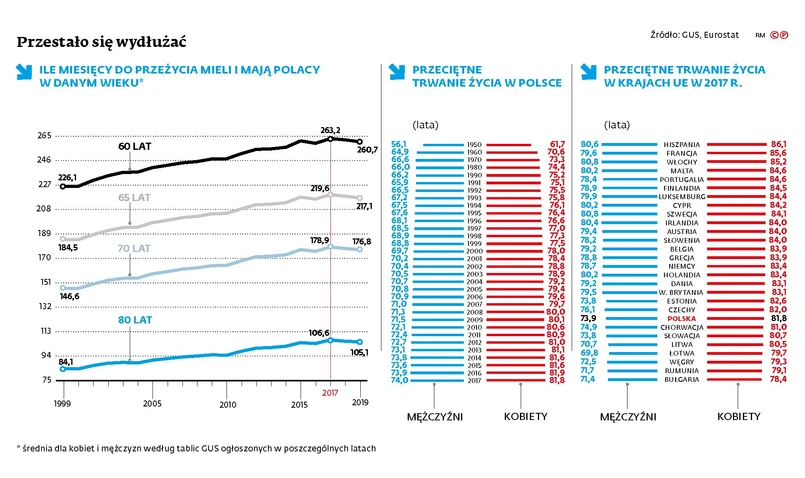 Pod względem przeciętnego trwania życia na tle czołówki krajów Unii Europejskiej wypadamy bardzo niekorzystnie. Według ostatnich danych Eurostatu wiek dożywania Polaków był w 2017 r. o ponad sześć lat krótszy niż w państwach Wspólnoty, które mają pod tym względem najlepsze wskaźniki. Natomiast przeciętne trwanie życia kobiet było o około cztery lata krótsze. Najdłużej żyją Włosi, Szwedzi i Hiszpanie – prawie 81 lat. Natomiast wśród kobiet najbardziej długowieczne są Hiszpanki, Francuzki i Włoszki. Ich przeciętne trwanie życia mieści się w przedziale od 85,2 do 86,1 roku. Duże różnice występują także w długości życia kobiet i mężczyzn. W Polsce wynoszą prawie 8 lat, podczas gdy w Holandii tylko 3,2 roku.