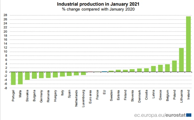W całej UE produkcja przemysłowa w styczniu wzrosła o 0,7 proc. m/m i wzrosła o 0,3 proc. w ujęciu rocznym. Wyrównana sezonowo produkcja przemysłowa w strefie euro wzrosła o 0,8 proc. m/m w styczniu 2021 r. Konsensus rynkowy wynosił 0,3 proc. wzrostu m/m dla strefy euro. W ujęciu rocznym, produkcja przemysłowa wzrosła o 0,1 proc. w strefie euro.