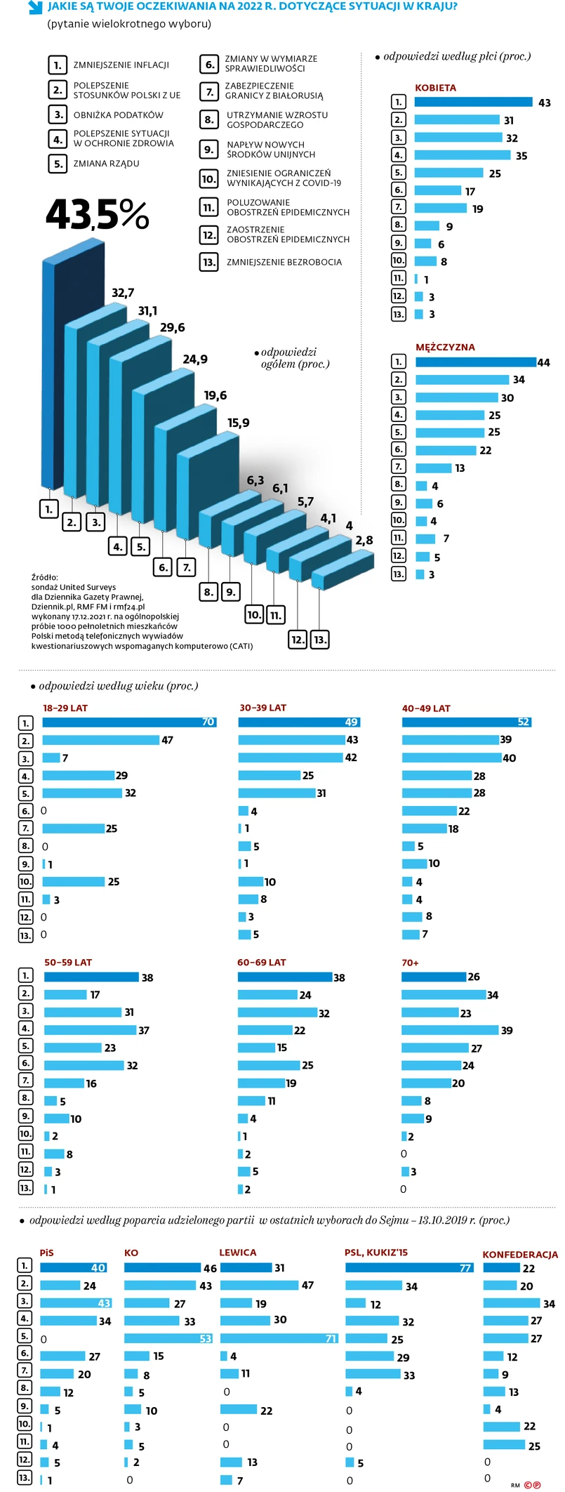 Na konieczność zwalczania wysokich cen zwróciło uwagę 43,5 proc. badanych. Przy czym widać tu różnice między elektoratami: zmniejszenia inflacji oczekuje 43 proc. wyborców opozycji, a tylko 24 proc. zwolenników obozu rządzącego. Mimo to w rządzie dominuje przeświadczenie, że drożyzna może być dla PiS niebezpieczna. - Inflacja to ogromne wyzwanie komunikacyjne, może nas zabić wizerunkowo. Wcześniej opowiadaliśmy, że ceny rosną, ale pensje też. Ale ludzie tego nie kupują - przyznaje osoba z rządu. Dlatego rząd zmienia narrację. - Teraz otwarcie przyznajemy, że jest ciężko, ale pracujemy nad tym, na ile to możliwe, by te skutki ograniczyć, np. wdrażając tarczę antyinflacyjną - dodaje nasz rozmówca. Inny wskazuje, że z czysto politycznego punktu widzenia istotne jest, by Polacy „zrozumieli, że podwyżki przyszły z zewnątrz i nie są winą rządu”.