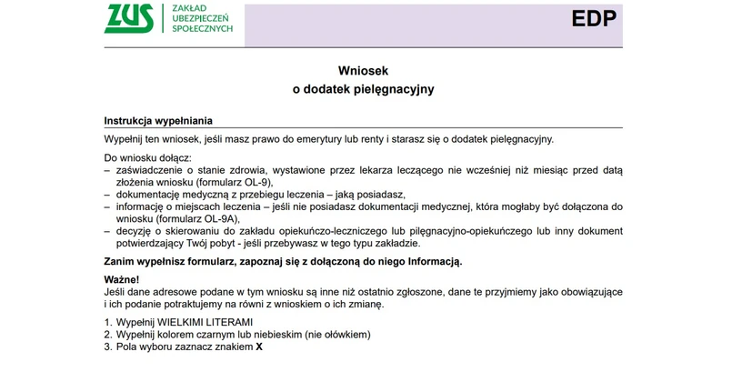 Czy złożenie wniosku EDP o dodatek pielęgnacyjny jest niezbędne do otrzymania świadczenia? Osoby, które ukończyły 75 lat nie muszą wysyłać wniosku do ZUS. Dodatek zostanie im przyznany z urzędu. Natomiast osoby młodsze, które są całkowicie niezdolne do pracy i do samodzielnej egzystencji już taki wniosek zgłosić muszą. Muszą posiadać orzeczenie lekarza orzecznika ZUS o całkowitej niezdolności do pracy oraz do samodzielnej egzystencji, a także zaświadczenie o stanie zdrowia od lekarza prowadzącego na druku OL-9. Data wystawienia nie może być wcześniejsza niż miesiąc przed złożeniem wniosku do ZUS. Do wniosku załącza się również ewentualną dokumentację medyczną (taką, którą się posiada). Warto dodać też informację o miejscach leczenia, szczególnie jeśli nie posiada się dokumentacji medycznej (formularz OL-9A). Dodatkowo w przypadku przebywania w zakładzie opiekuńczo-leczniczym lub pielęgnacyjno-opiekuńczym, do wniosku dołącza się decyzję o skierowaniu do tego zakładu lub inny dokument potwierdzający pobyt w zakładzie.
