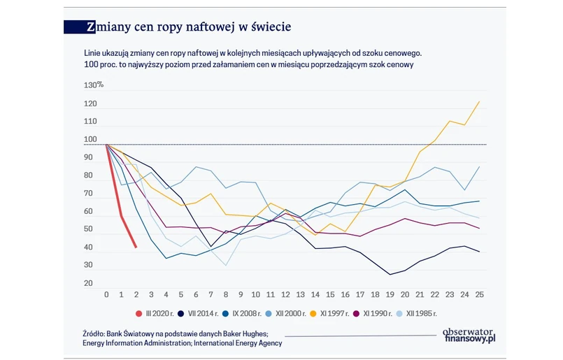 Od 1970 r. cena ropy spadała w tak krótkim okresie o 30 i więcej procent aż siedem razy. W pięciu przypadkach, w latach 1990-1991, 1998, 2001, 2008-2009 oraz w 2020 r. do szoku cenowego w największym stopniu przyczynił się nagły spadek popytu na ropę. Dwukrotnie, w latach 1985-1986 oraz w latach 2014-2016, główną przyczyną był nadmiar jej podaży. Spadki cen wynikające ze zmniejszenia aktywności gospodarczej w świecie (lata 1998 i 2001), jak wynika z analiz Banku Światowego, były bardziej krótkotrwałe i cena ropy powracała do poziomu sprzed kryzysu w okresie kolejnych 4 lat. Szoki cenowe, które wynikały z nadmiaru podaży były bardziej długotrwałe.