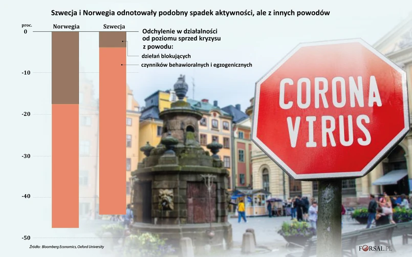 Ostatecznie spadki aktywności gospodarczej w obu krajach były na podobnym poziomie, choć powody tych spadków były nieco inne. Bloomberg Economics oszacował, jaka część spadku wynikała z polityki blokowania gospodarki w porównaniu z innymi czynnikami hamującymi wzrost. Wykres pokazuje, że w przypadku Norwegii oba czynniki były mniej więcej w równowadze, podczas gdy dobrowolne zmiany w zachowaniu dystansu społecznego i słaby popyt globalny odegrały dominującą rolę w przypadku Szwecji.