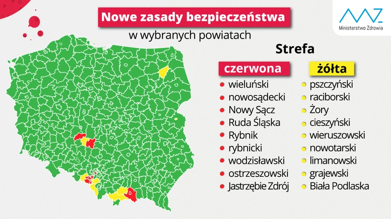 Na konferencji prasowej w MZ poinformowano o planowanym wprowadzeniu dodatkowych obostrzeń w powiatach z największym przyrostem zakażeń. MZ wprowadzi w tych powiatach dwa rodzaje obostrzeń - wyższy "czerwony" i łagodniejszy "żółty".