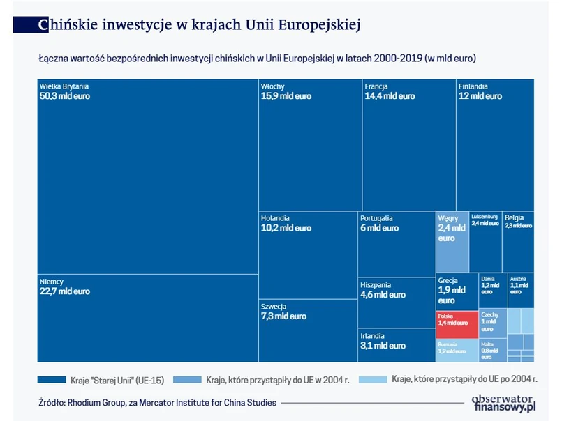 Rosnąca w Unii Europejskiej nieufność wobec chińskich spółek sprawiła, że w 2019 roku chińskie inwestycje w Unii spadły o 33 proc. – z 18 do 12 mld euro. Szczególnie niechętne chińskim inwestycjom były trzy największe gospodarki: Niemcy, Wielka Brytania i Francja, których udział jako gospodarzy spadł w 2019 roku do 34,6 proc., w porównaniu z 45 proc. w 2018 roku i 71 proc. w 2017 roku. Inwestycje chińskich przedsiębiorstw państwowych spadły do 11 proc. całości transakcji fuzji i przejęć, choć państwo chińskie w rozmaity sposób kontroluje także spółki prywatne. Ale w latach 2010-2015 ponad 70 proc. chińskich inwestycji w Europie dokonywały firmy państwowe.