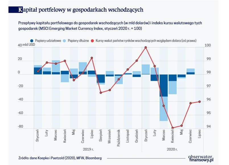 Tematyka przepływów kapitału na świecie powraca co jakiś czas na nagłówki gazet finansowych. Ostatnio stało się tak w I połowie 2020 r., kiedy to ze względu na wyraźne pogorszenie perspektyw gospodarczych na świecie oraz wzrost awersji do ryzyka na światowych rynkach finansowych nastąpił silny odpływ kapitału portfelowego z gospodarek wschodzących. W efekcie tego odpływu nastąpiła silna deprecjacja kursów walutowych oraz wzrost rentowności obligacji skarbowych wielu z tych gospodarek. W tych warunkach, rynkowe finansowanie potrzeb pożyczkowych przez te kraje stało się bardzo kosztowne lub wręcz niemożliwe. W związku z tym, od wybuchu pandemii rządy ponad osiemdziesięciu gospodarek wschodzących były zmuszone wystąpić do Międzynarodowego Funduszu Walutowego o pożyczki, których łączna skala wyniosła jak dotąd 89 miliardów dolarów.
