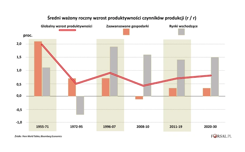 W latach 1955-71 średni ważony roczny wzrost produktywności na świecie liczony rok do roku wynosił 2 proc., po czym spadł do 0,5 proc. w okresie 1972-95. Bloomberg Economics prognozuje, że między 2020 a 2030 r. w scenariuszu bazowym globalna produktywność będzie rosła w tempie ok. 0,8 proc. rocznie, co oznacza nieznaczne przyspieszenie w porównaniu z ostatnią dekadą.