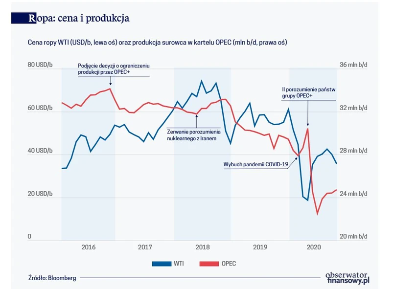 W kwietniu br. kraje grupy OPEC+ (czyli państwa OPEC oraz 10 krajów spoza kartelu: Azerbejdżan, Bahrajn, Brunei, Kazachstan, Malezja, Meksyk, Oman, Rosja, Sudan Południowy, Sudan), w wyniku utrzymywania się szoku popytowo-podażowego, który doprowadził do załamania się globalnych cen ropy naftowej, zawarły nowe porozumienie dotyczące ograniczenia wydobycia surowca na niespotykaną dotychczas skalę. Zgodnie z podpisaną umową, produkcja ropy naftowej w okresie dwóch pierwszych miesięcy, tj. od 1 maja do 30 czerwca 2020 roku, miała być zmniejszona o 9,7 mln b/d, a w kolejnych miesiącach wprowadzone ograniczenia miały być stopniowo zmniejszane.