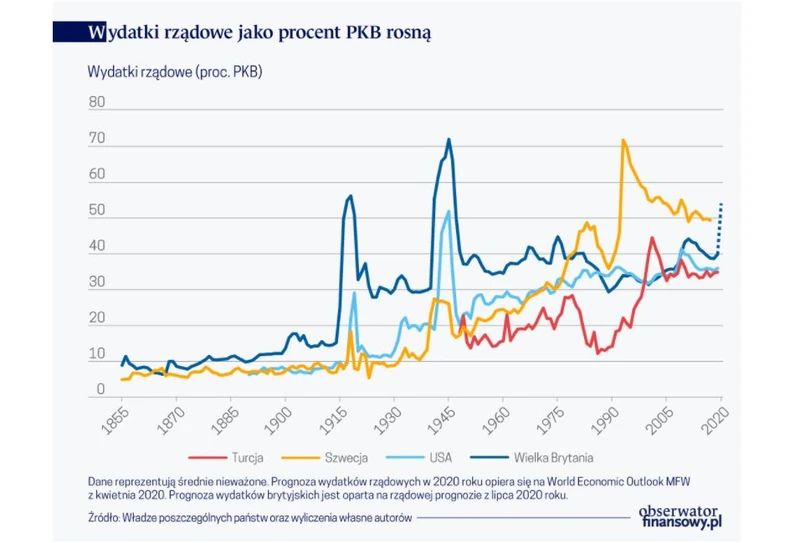 Przykładowo w drugiej połowie XIX wieku wydatki rządowe odniesione do PKB w Szwecji, USA i Wielkiej Brytanii kształtowały się na poziomie 6-10 procent średniorocznie. Wiek XX to już wyraźny trend wzrostowy tego wskaźnika – do ok. 40 procent na początku lat 90. w wymienionych krajach.