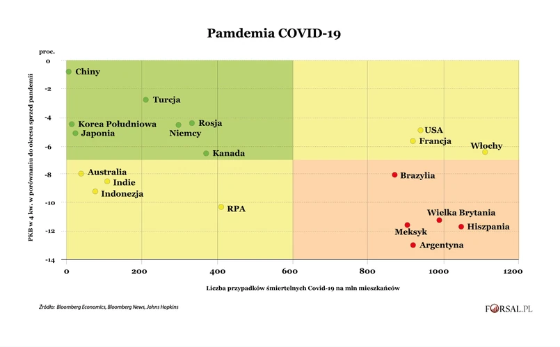 W grupie państw, które potrafiły skutecznie poradzić sobie zarówno z ochroną życia chorych na Covid-19, jak i utrzymaniu gospodarki na przyzwoitym poziomie są Japonia i Korea Południowa, podczas gdy Wielka Brytania, Hiszpania i Argentyna to państwa, które nie znalazły sposobu na skuteczną obronę przed atakiem koronawirusa.