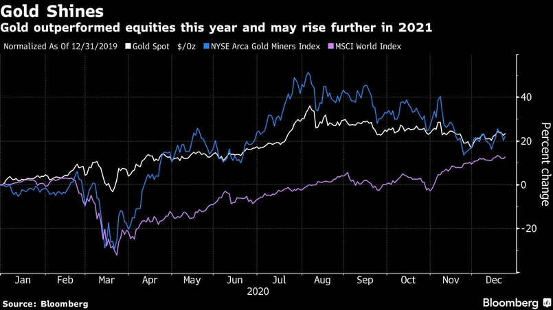 W sierpniu cena złota (spot) osiągnęła historyczne maksimum. Jednak po wprowadzeniu szczepionek na Covid-19 zmniejszył się popyt na bezpieczne inwestycje i złoto zaczęło tanieć. Mimo to roczny zysk na złocie nadal utrzymuje się na poziomie około 24 proc., podczas gdy światowy indeks akcji FTSE jest na dobrej drodze do osiągnięcia zwrotu na poziomie 13 proc. w 2020 r. Tymczasem indeks NYSE Arca Gold Miners wzrósł o 23 proc.