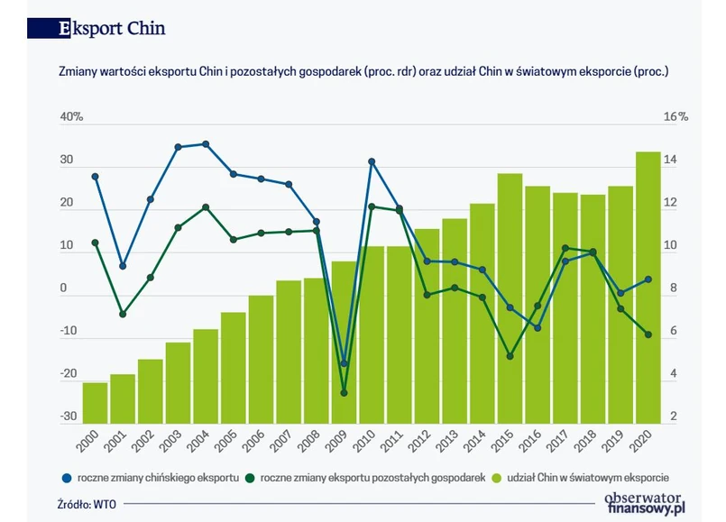 Największy wzrost eksportu w 2020 r. w liczbach bezwzględnych nastąpił w Chinach. Jego wartość w porównaniu z rokiem poprzednim zwiększyła się o 92 mld dolarów, a więc o 3,7 proc. Nie był to spektakularny wzrost, biorąc pod uwagę dynamikę chińskiego eksportu w poprzednich latach. W latach 2001-2019 jego wartość rosła bowiem średnio w tempie 12,9 proc. rocznie. Jednak ze względu na wyraźny spadek eksportu w pozostałych krajach traktowanych łącznie (9,2 proc. rdr), dysproporcja między dynamiką eksportu Chin i pozostałych krajów świata była największa od piętnastu lat.
