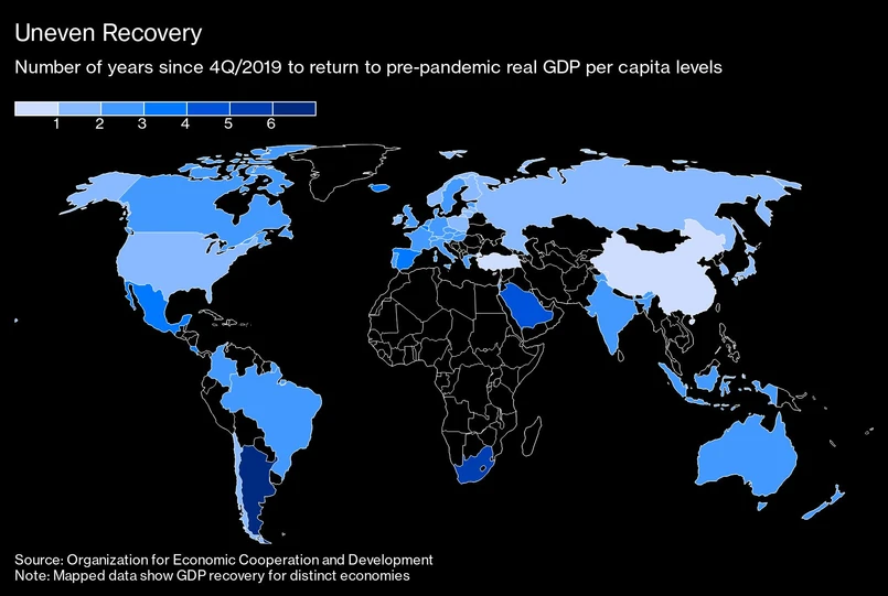 Zgodnie z nowymi prognozami w krajach takich jak Argentyna i Hiszpania, od wybuchu pandemii do pełnego ożywienia produkcji gospodarczej na mieszkańca miną ponad trzy lata. To długo biorąc pod uwagę, że w USA powrót do poziomów sprzed pandemii zajmie zalewie 18 miesięcy, a w Chinach mniej niż rok.