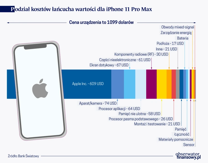 Podobnie jest w przypadku nowego modelu IPhone’a 11 Pro Max, dostępnego na rynku amerykańskim za niespełna 1,1 tys. dolarów. Im wyższa pozycja w łańcuchu przetwórczym, tym większy udział w dzielonym torcie, a właściwie jabłku. Koszt nabycia sensorów, baterii, pamięci nie przekracza – każdorazowo – 10 dolarów. Kompletowanie i testowanie podzespołów – 21 dolarów, procesor do zarządzania funkcjami telefonu – 26 dolarów, system podtrzymywania pamięci telefonu pomimo braku zasilania – 58 dolarów, procesor aplikacji – 64 dolary, ekranu telefonu – 67 dolarów, aparat fotograficzny – 74 dolary. Producent finalny – Apple – inkasuje 609 dolarów, ponad połowę sumy z rachunku za nowy smartfon.
