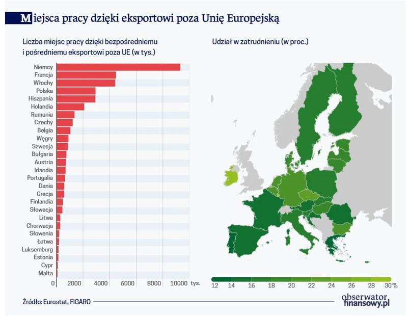 Z opublikowanych przez Eurostat w lipcu 2021 r. danych za 2019 r. wynika, że eksport poza obszar Unii Europejskiej (faktyczny eksport z UE, handel pomiędzy krajami unijnymi to wymiana wewnątrzwspólnotowa) daje pracę 37 mln wśród 209 mln pracowników. Są pod tym względem znaczne dysproporcje. „Na eksport” najliczniej pracują pracownicy w Irlandii, blisko co trzeci z nich (29,4 proc.,) zajmuje się produkcją wyrobów lub ich podzespołów, bądź świadczeniem usług przeznaczonych na rynki pozaunijne.