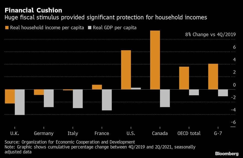Jak wynika z danych OECD, wyłączając Stany Zjednoczone, do końca drugiego kwartału tego roku realny dochód na mieszkańca w najbardziej rozwiniętych państwach nadal rósł, choć w wolniejszym tempie.