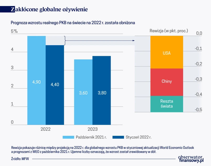 MFW obawia się, że pojawienie się ostrzejszych wariantów koronawirusa może przedłużyć kryzys. Chińska strategia zero-COVID może pogłębić globalne zakłócenia w dostawach, a problemy tamtejszych deweloperów mogą rozlać się na całą gospodarkę. Do tego wyższe odczyty inflacji w USA mogą wywołać radykalne zacieśnienie polityki pieniężnej przez Fed, co pogorszy warunki kredytowe na całym świecie. Fundusz eufemistycznie pisze też o „rosnących napięciach geopolitycznych i niepokojach społecznych, które zagrażają perspektywom wzrostu”. I faktycznie – przy poprzedniej edycji prognoz jesienią 2021 r. scenariusz powtórnej inwazji Rosji na Ukrainie nie był nawet rozpatrywany.