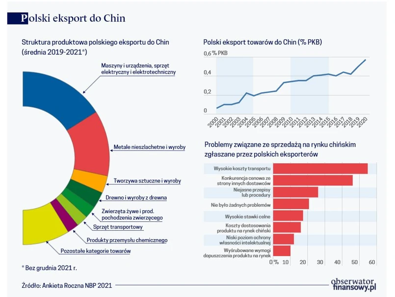 Polska wymiana handlowa z Chinami ulega intensyfikacji mimo nierównowagi między importem a eksportem. Chiny są dla nas 2. pod względem wielkości kierunkiem importu towarów i dopiero 19. kierunkiem eksportu towarów. W całym 2020 r. Polska wyeksportowała do Chin towary o wartości 13,2 mld złotych, co stanowiło 1,2 proc. wartości polskiego eksportu. Wartość polskiego importu towarów z Chin jest 10-krotnie wyższa niż eksportu w tym kierunku. W 2020 r. import z Chin wyniósł 146,6 mld złotych, odpowiadając za 14,4 proc. wartości polskiego importu towarów.