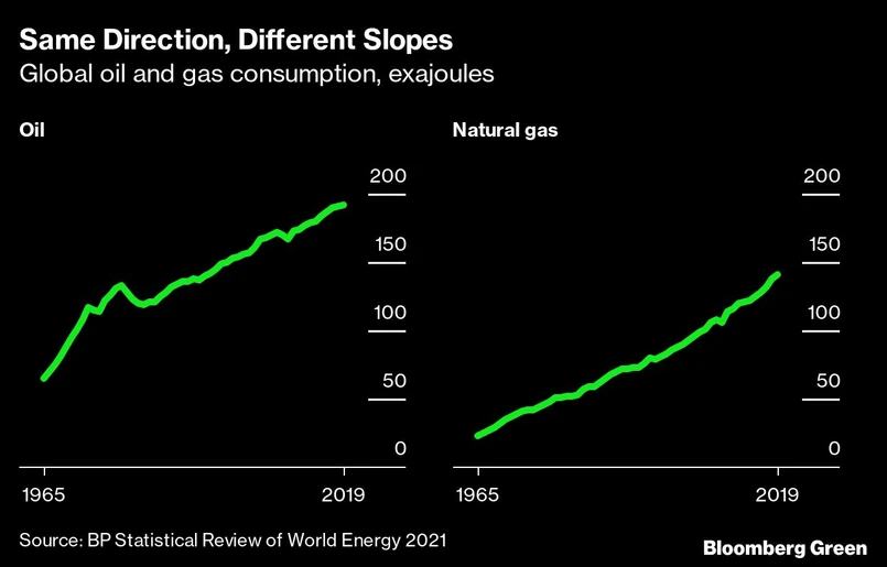 Konsumpcja obu tych surowców znacznie wzrosła od połowy lat 60 XX wieku, ale w różnym stopniu i z różnymi charakterystykami. Ropa nadal stanowi większą część energii niż gaz, przy czym gaz dopiero teraz osiąga mniej więcej taką samą ilość globalnej podaży energii, jak ropa w połowie lat 90. XX wieku.