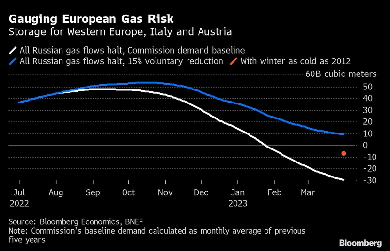 Według Bloomberg Economics ograniczenie zużycia gazu powinno zapewnić Europie przetrwanie następnej zimy, nawet jeśli rosyjski przepływ surowca zostanie całkowicie zatrzymany i będzie kosztować gospodarkę strefy euro około 0,4 proc. PKB.