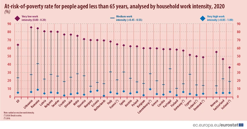 W UE wskaźnik zagrożenia ubóstwem wśród osób w wieku poniżej 65 lat, żyjących w gospodarstwach domowych o bardzo niskiej intensywności pracy wyniósł 64 proc. w 2020 r. Wskaźnik ten wahał się od 48,7 proc. w Danii i 49,9 proc. w Irlandii, do ponad 70 proc. ludności w dziewięciu państwach członkowskich UE. Najwyższy poziom (85,4 proc.) wskaźnik ten osiągnął na Litwie, a następnie w Rumunii (84,2 proc.) i Łotwie (80,6 proc.). Polska w tym zestawieniu plasuje się w środku stawki, ze wskaźnikiem na poziomie 62 proc.