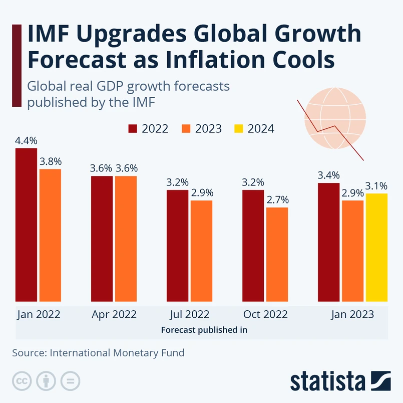 Oczekuje się, że globalny wzrost gospodarczy spadnie z 3,4 proc. w 2022 r. do 2,9 proc. w tym roku, po czym odbije do 3,1 proc. w 2024 r. Prognoza wzrostu na 2023 r. jest wyższa od październikowych szacunków na poziomie 2,7 proc., ponieważ według MFW znacznie mniej państw stoi w obliczu recesji.